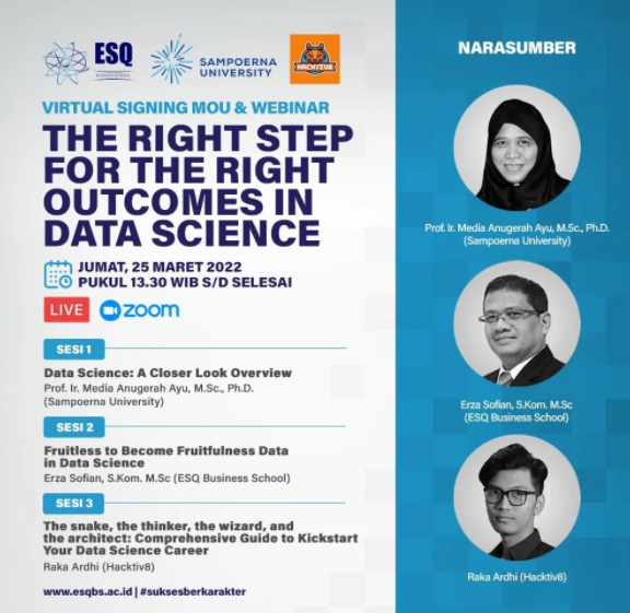 ESQNews.id, JAKARTA – Jumat 25 Maret 2022 pukul 13.30 WIB, ESQ Business School akan menggelar acara Virtual Signing MOU & Webinar dengan tema “The Right Step for The Right Outcomes in Data Science.”
