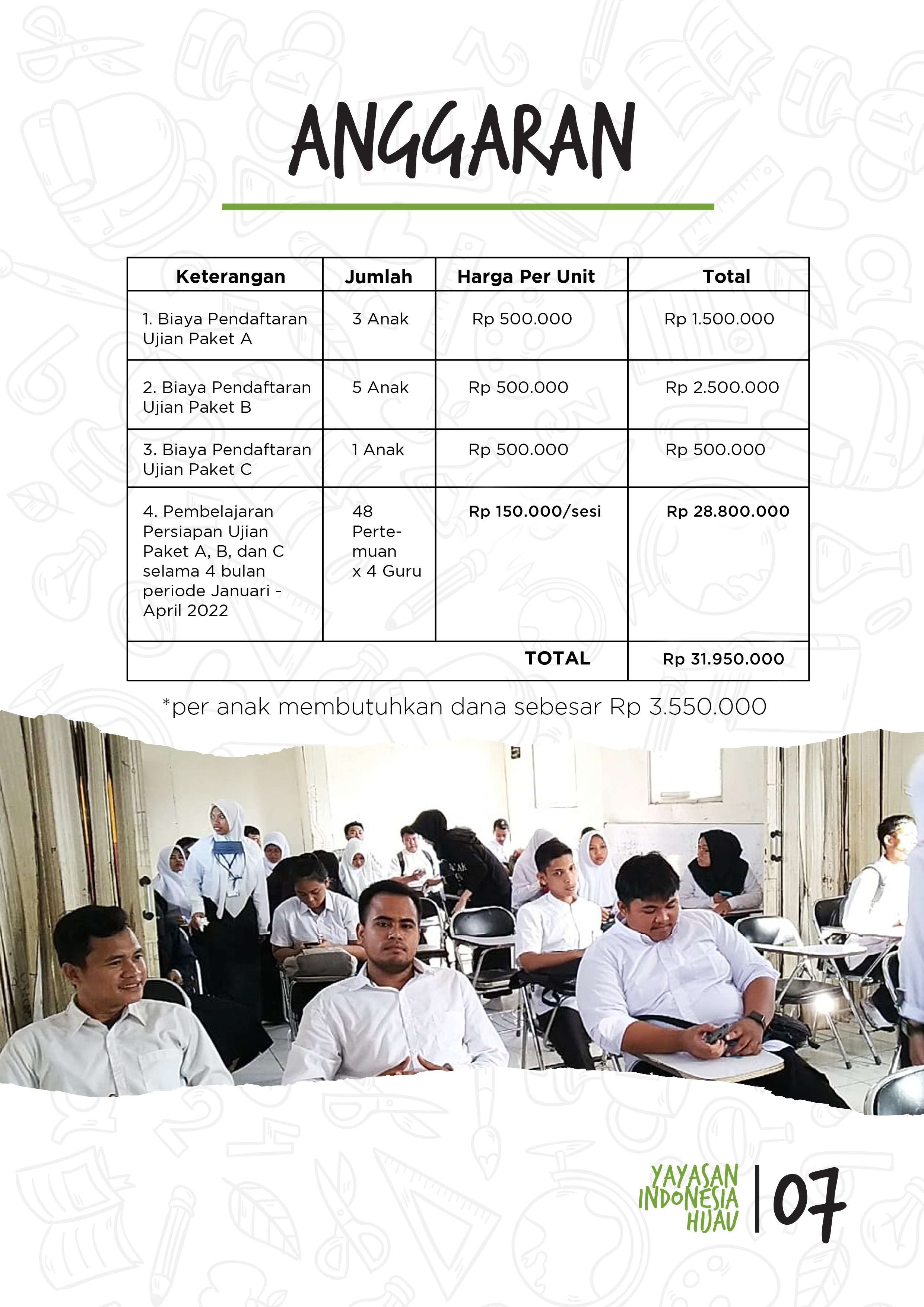 “Tidak layakkah mereka juga mendapatkan fasilitas pendidikan untuk menyongsong kehidupan yang lebih baik lagi? Tentunya layak. Oleh karena itu diperlukan peran serta seluruh elemen masyarakat guna merangkul kelompok masyarakat pra sejahtera demi terputusnya mata rantai kebodohan dan kemiskinan,” tutur Viriana, salah satu Volunteer Yayasan Indonesia Hijau.