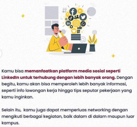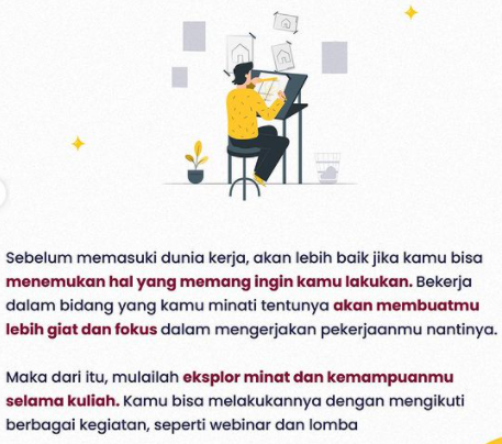 “Itulah persiapan yang harus kamu miliki sebelum memasuki dunia kerja. Pada umumnya, proses transisi dari masa perkuliahan ke dunia professional bukanlah suatu hal yang mudah. Akan tetapi, ada beberapa hal yang akan membuat proses tersebut menjadi lebih mudah. Sehingga kamu bisa mempersiapkannya secara matang.” – Sejuta Cita
