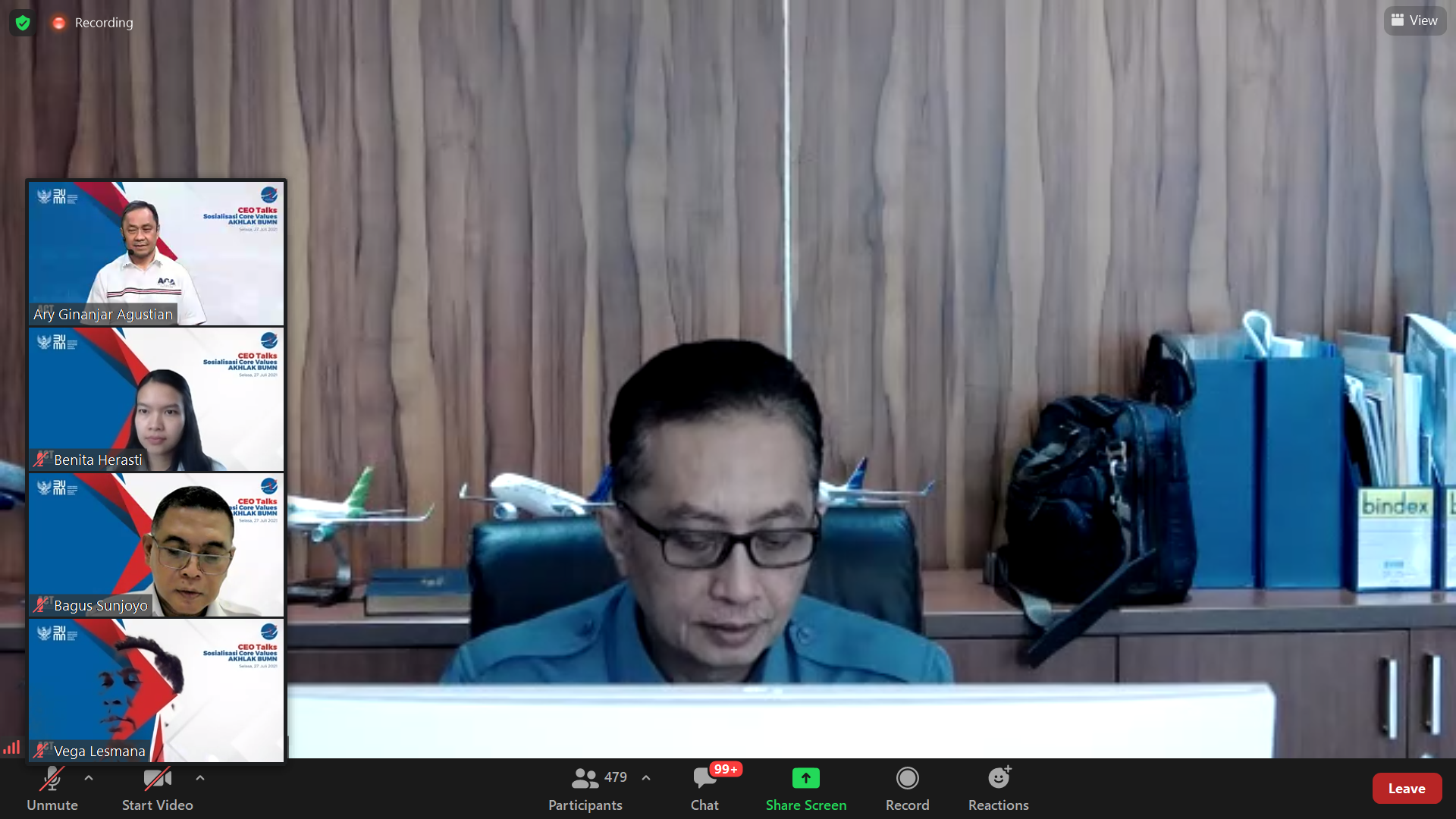 Terlihat dari layar zoom, Ary tersenyum diiringi dengan tepuk tangan yang gemuruh dari insan yang berperan aktif dalam penerbangan itu.