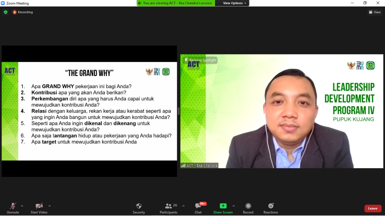ESQNews.id, JAKARTA - Telah  berlangsung Training Leadership Development Program Pupuk Kujang Bacth 1 pada Rabu (16/12/2020) by Zoom Meeting. Sebuah program yang berkolaborasi dengan tim ACT Consulting.
