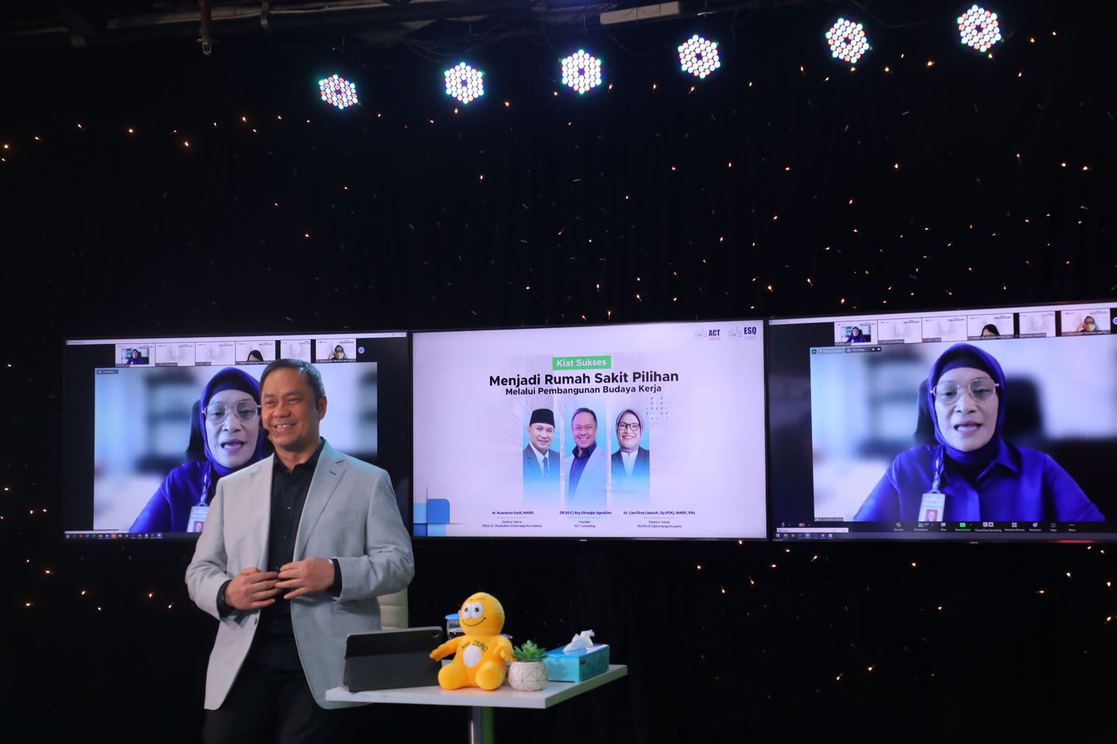 Tampil sebagai pembicara dr. Lies Dina Liastuti, SpJP(K), MARS, FIHA (Direktur Utama RSUP Nasional Dr. Cipto Mangunkusumo) bersama dr. Kusnanto Saidi , MARS (Direktur RSUD dr. Chasbullah Abdulmadjid Kota Bekasi), dan Dr. HC. Ary Ginanjar Agustian, Founder ACT Consulting.