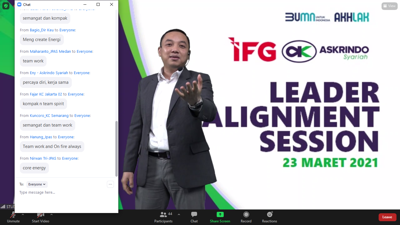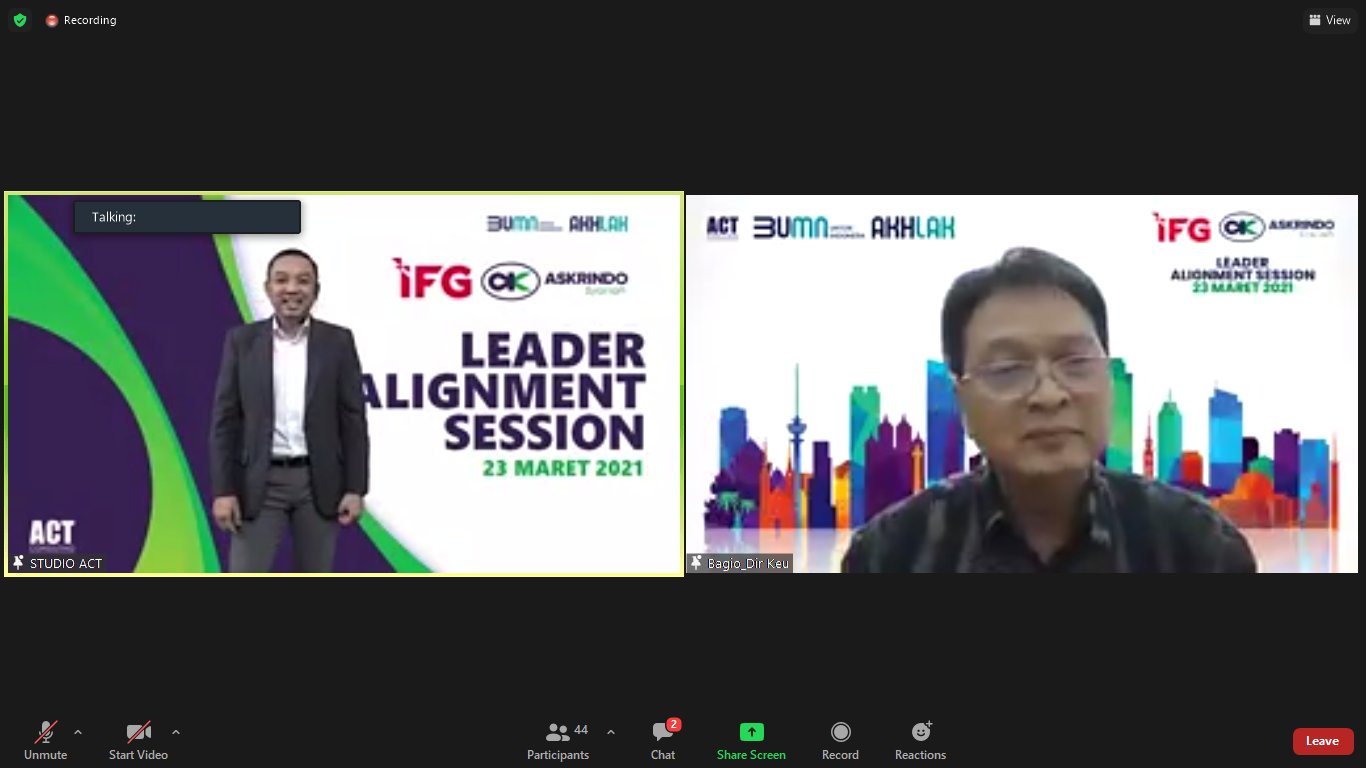 ESQNews.id, JAKARTA - Leaders PT Jaminan Pembiayaan Askrindo Syariah ikuti event yang digelar oleh ACT Consulting pada Selasa (23/3/2021) secara online, dengan mengusung tema "Leader Aligment Session ASKRINDO SYARIAH."