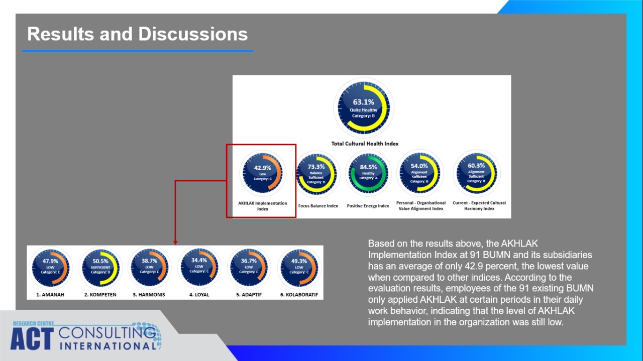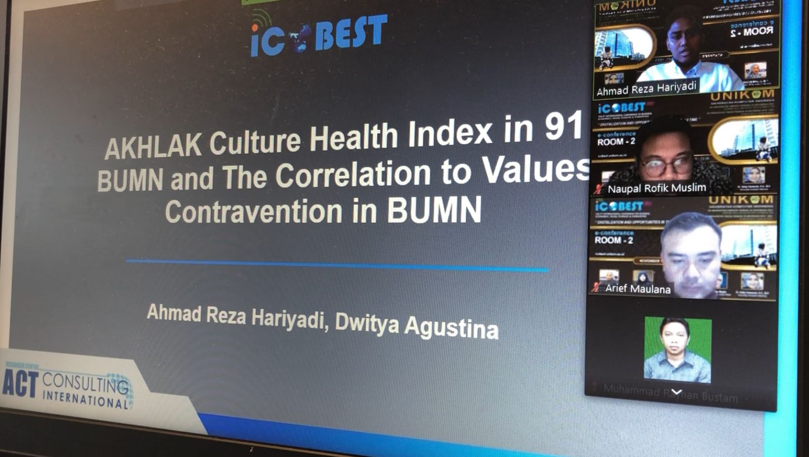 Dalam perhelatan tersebut, Ahmad Reza Hariyadi yang juga merupakan kandidat doktor dari Universiti Utara Malaysia dan tim dari ACT Consulting International berhasil menjadi Best Presenter. Berdasarkan temuan dari hasil penelitian tersebut, Reza menyampaikan bahwa hal ini perlu menjadi concern dari Kementerian BUMN dan seluruh perusahaan BUMN untuk melakukan pengukuran ACHI (AKHLAK Culture Health Index) secara komprehensif. Sehingga diharapkan nantinya seluruh perusahaan BUMN mampu menyiapkan Action Plan dan langkah strategis dalam menghadapi issue tersebut, agar visi “BUMN untuk Indonesia” bisa tercapai.
