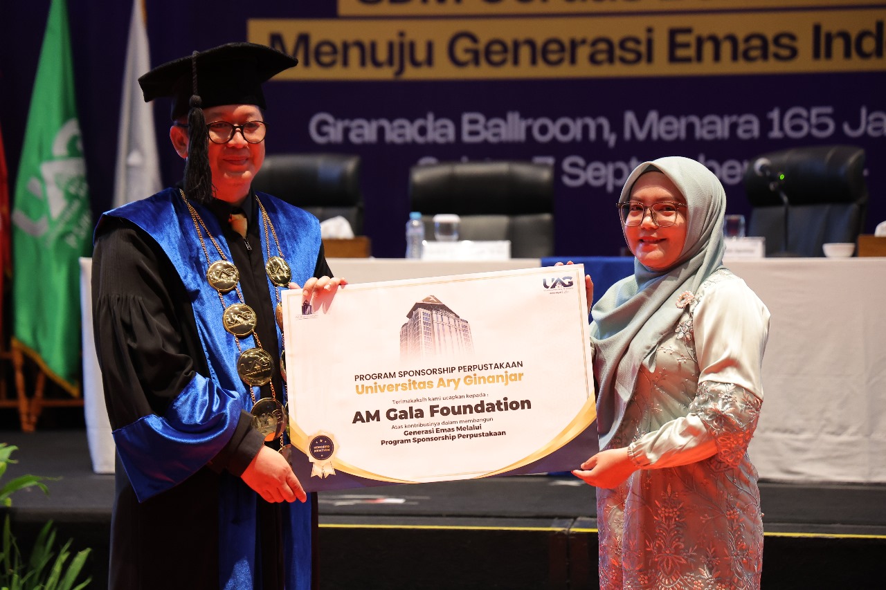 Diketahui, telah berlangsung juga Simbolis Penyerahan Sponsor Perpustakaan UAG University dari AMGala Foundation saat Wisuda ke 8 dan Welcoming Reception 2024/2025 UAG University di Ruang Granada Menara 165, Jakarta, Sabtu (7/9/2024).