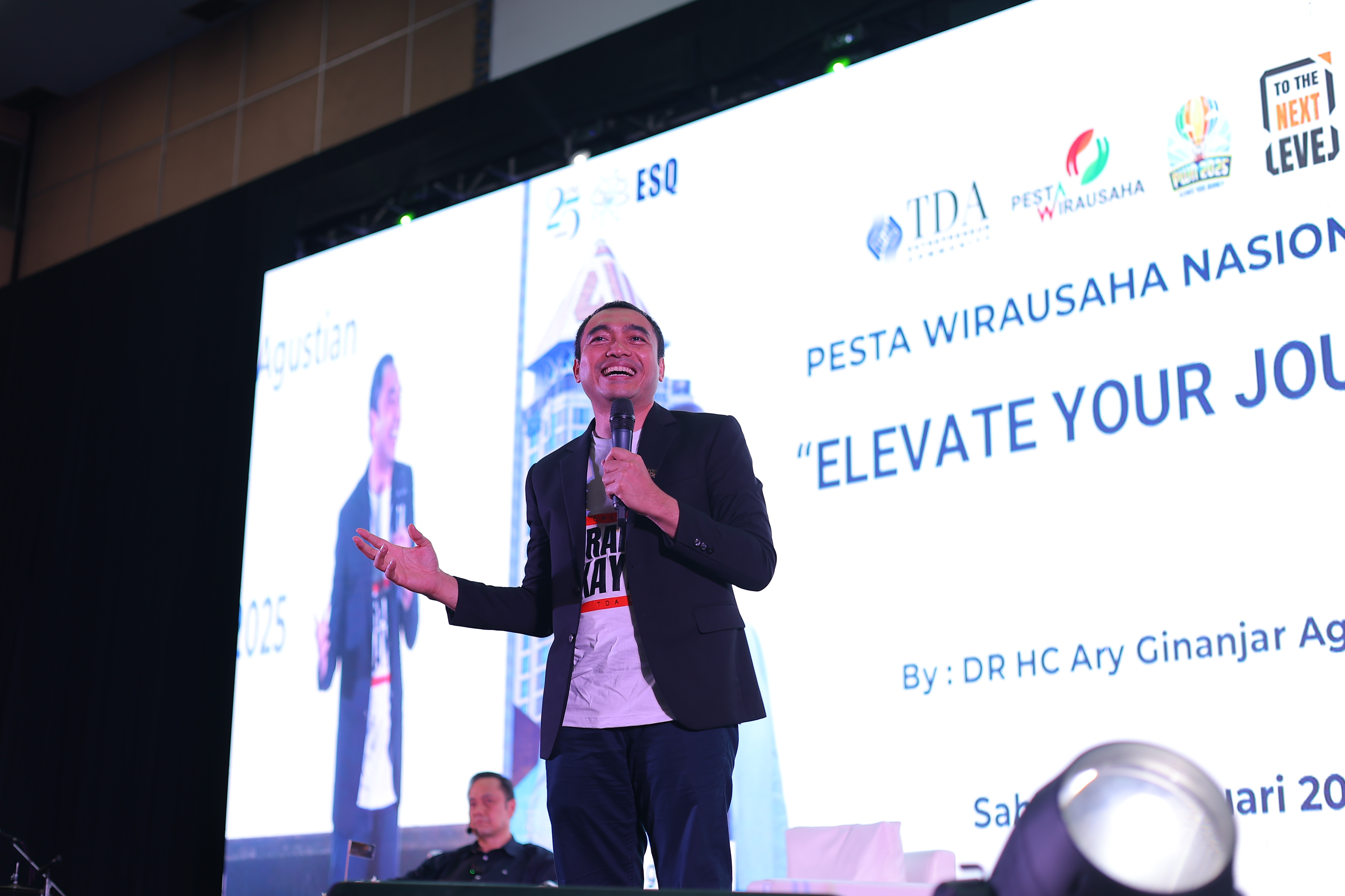 Salah satu sesi yang paling menggugah adalah saat Dr. (H.C) Ary Ginanjar Agustian, Founder ESQ dan UAG University, tampil menyampaikan pidato transformasional bertajuk “Next Level Business yang Eksponensial” di hadapan ribuan peserta.