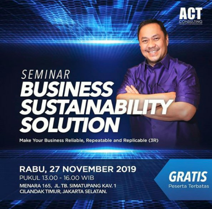 Seminar Business Sustainability Solution dilaksanakan tanggal 27 November 2019, pukul 13.00 - 16.00 WIB. Diselenggarakan di Menara 165, Cilandak, Jakarta Selatan. Seminar ini Free Of Charge Bagi Bisnis Owner.