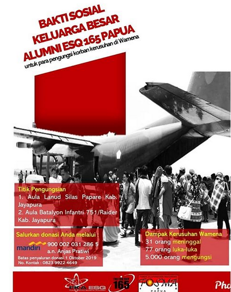 Kami keluarga besar Alumni ESQ 165 Papua mengajak Ayah dan Bunda serta rekan rekan sekalian untuk meringankan beban saudara kita. Mari ringankan beban mereka, seperti yang telah baginda Rasul sampaikan.