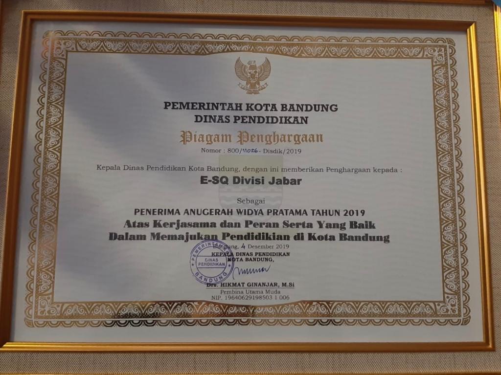 Alhamdulilah upaya yang ESQ lakukan mendapatkan apresiasi dari Dinas Pendidikan Kota Bandung Anugerah Widya Pratama tahun 2019 kategori Kerjasama Lembaga Pendidikan Non Formal.
