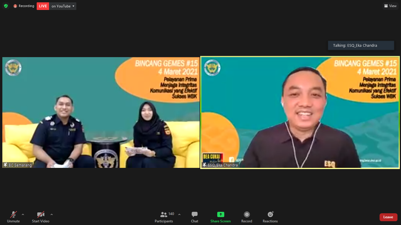 “Pelayanan Prima, Menjaga Integritas, Komunikasi yang Efektif, Sukses WBK” adalah tema yang dipilih untuk mengisi seminar pada Kamis (4/3/2021) secara virtual.