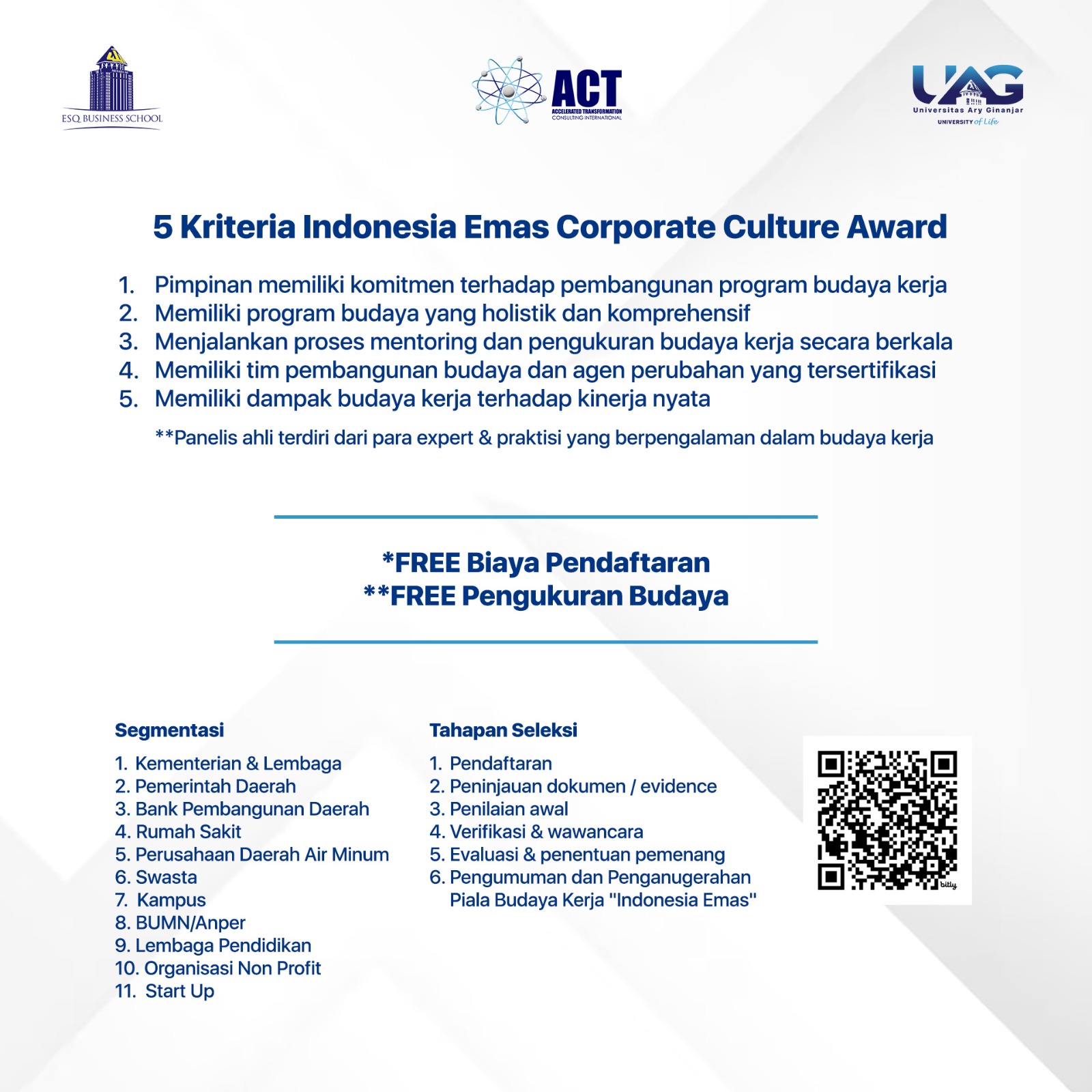 Untuk mewujudkan Indonesia Emas 2045 maka ACT Consulting International (ESQ Corp) bersama dengan ESQ Business School dan UAG University menyelenggarakan kompetensi atau ajang apresiasi dan pengakuan kepada organisasi yang telah menjadi contoh dalam membangun budaya kerja yang inklusif, kolaboratif, dan inspiratif.