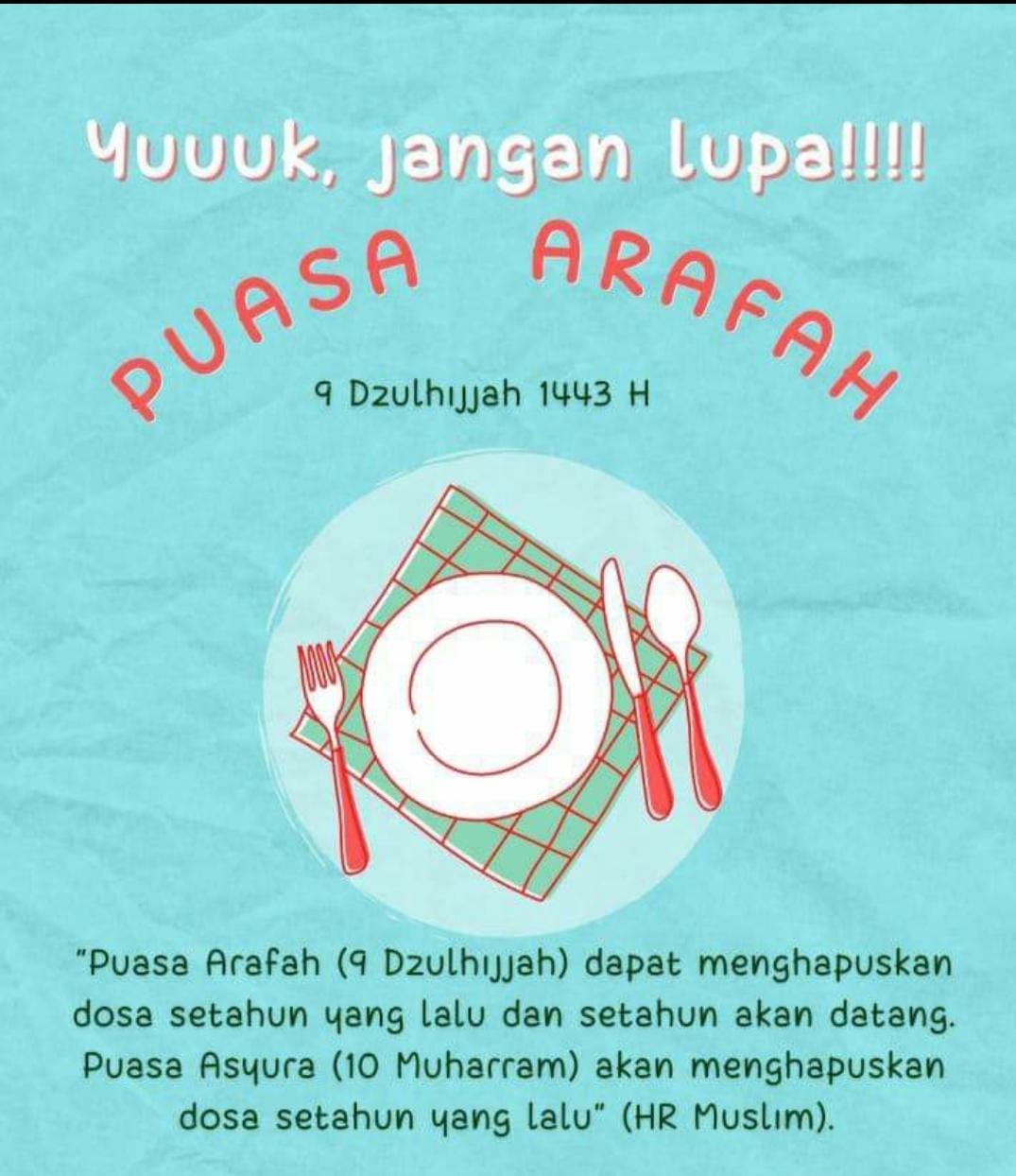 Semoga Allah mengampuni dosa saya antara Jumat ini dan Jumat berikutnya serta tambahan tiga hari. Semoga Allah juga menerima puasa saya yang tidak mampu berhaji (wukuf). Rasulullah bersabda, "Puasa hari Arafah menghapus dosa tahun lalu dan tahun yang akan datang. Khususnya dosa kecil, sedangkan dosa besar harus melalui taubatan nasuha."
