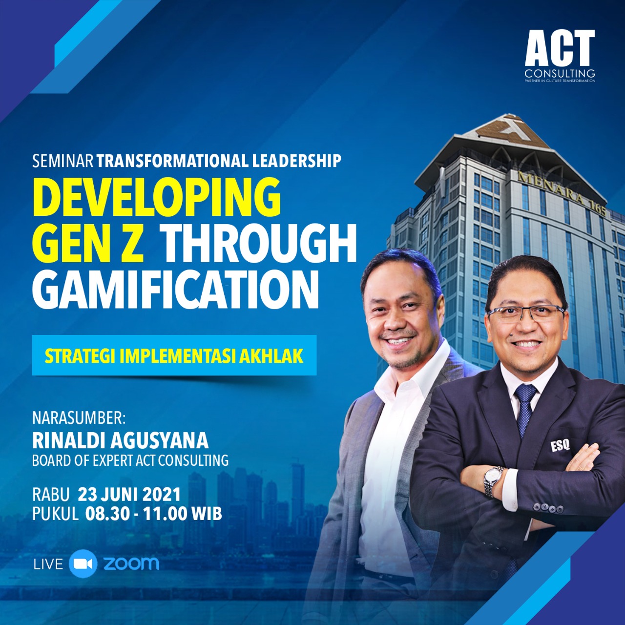 Untuk mencari tahu hal itu, hadirilah FREE SEMINAR bertajuk DEVELOPING GEN Z THROUGH GAMIFICATION - Strategi Implementasi AKHLAK pada Rabu 23 Juni 2021 pukul 08.30 - 11.00 WIB via ZOOM Meeting.