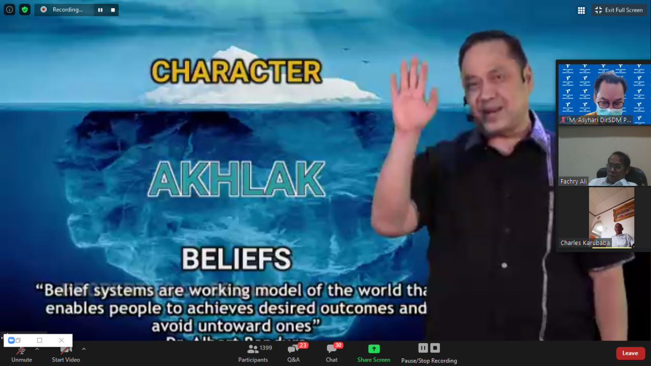 “Untuk generasi baru itu yang diharapkan pak Menteri adalah sampai ke level belief systems. Target kita harus mampu menemukan AKHLAK dari diri karyawan sendiri. Kalau itu berhasil ditemukan maka dia akan selaras dengan AKHLAK ini. Bukan hanya secara intelektual saja. Tapi emosional dan spiritual,” tutur Ary Ginanjar Agustian saat Webinar Sosialisasi & Internalisasi Core Values AKHLAK - Great AKHLAK for Great Pelindo IV pada (21/7/2020).