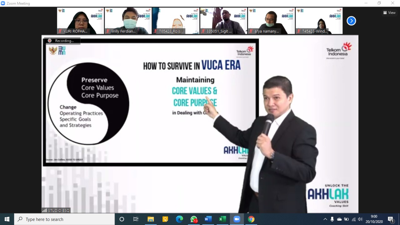 “Cara bertahan di Era VUCA yang serba tidak jelas, terus berubah, tidak ada kepastiaan ini adalah dengan memegang teguh Core Values dan Core Purpose khususnya di Telkom ini. Itulah pondasinya, harus diperkokoh,” kata Coach Arief.
