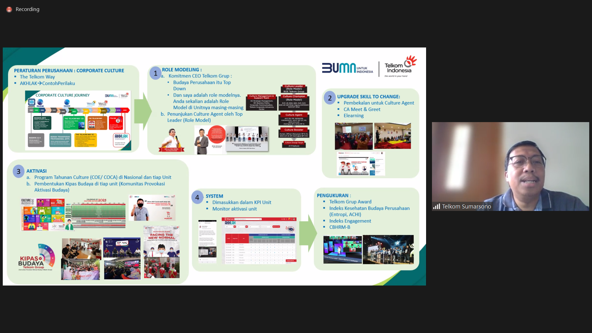 Sumarsono (Telkom) menjelaskan peraturan perusahaan (corporate culture) yang terbagi menjadi The Telkom Way dan AKHLAK (contoh perilaku). Kemudian diperjelas lagi menggunakan gambar yang terdiri dari program role model, upgrade skill to change, aktivasi, system, dan pengukuran dalam bentuk indeks engagement, Telkom grup award, Indeks Kesehatan Budaya Perusahaan (ACHI).