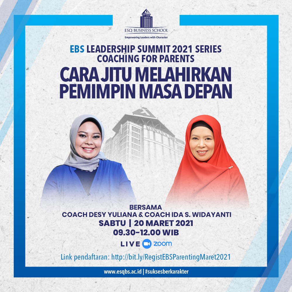 ESQ mempersembahkan event “Coaching for Parents” dengan tema “Cara Jitu Melahirkan Pemimpin Masa Depan”, yang akan diselenggarakan pada Sabtu (20/3/2021) pukul 09.00-12.00 WIB Live on Zoom Meeting.