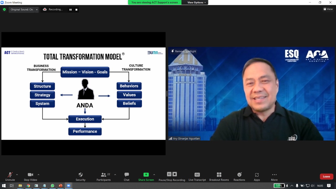 "Setiap perusahaan atau organisasi memiliki visi, misi, dan tujuan yang luhur di dalamnya. Sehingga para leaders bersama jajarannya membentuk business transformation yang terdiri dari struktur, strategi dan system. Setelah itu, kita bisa eksekusi atau melihat hasilnya (dari performance)," papar Ary sambil tersenyum.