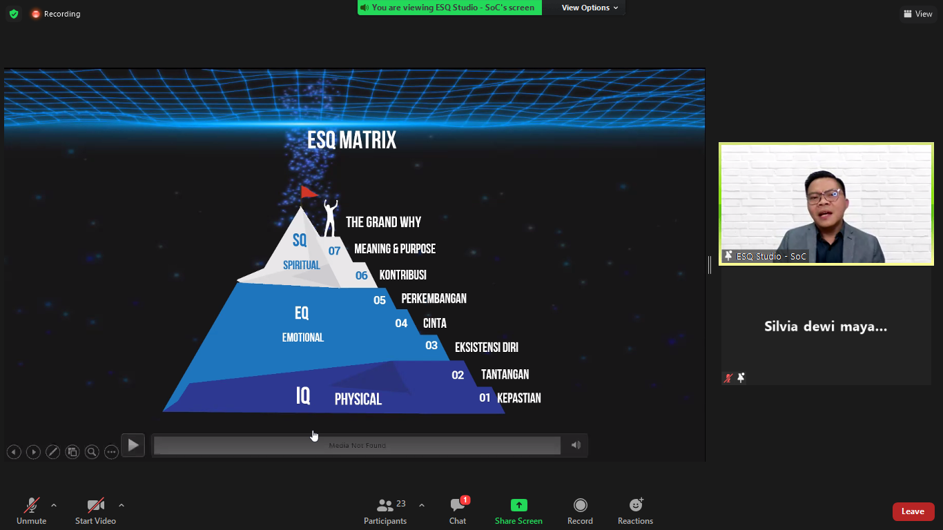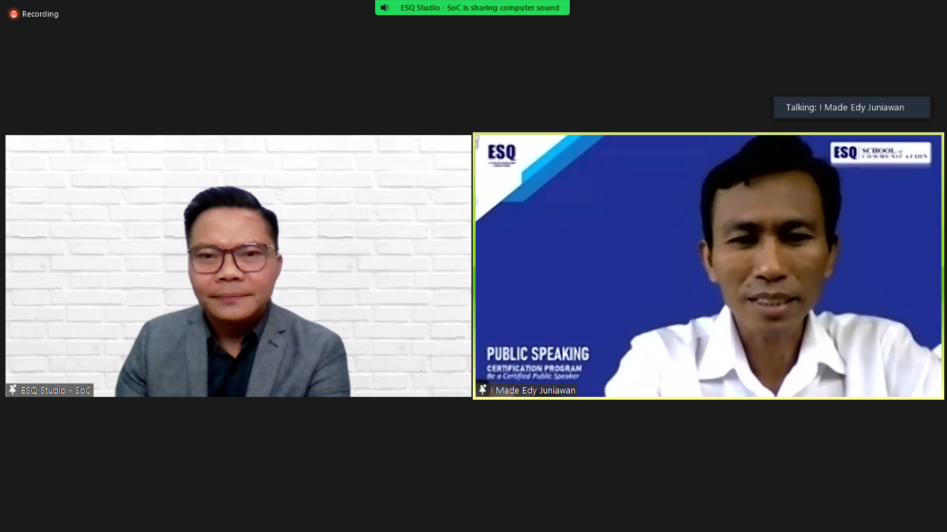 “Good. Namun apakah kita hanya mencari yang terpenting dari tingkat physical, emosional saja? Adakah purpose lain yang lebih tinggi dari itu? Saya akan jelaskan dan jawab melalui ESQ matrix. Bahwa jadi seorang pembicara hebat bukan sekedar purpose yang sifatnya intelektual semata. Kira-kira apa itu? Boleh sharing?” papar pria yang expert di public speaking itu.
