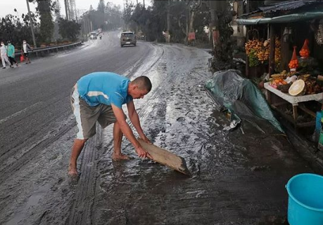 Di sela-sela bencana, warga membersihkan jalanan dari abu vulkanik setelah erupsi Gunung Taal di Tagaytay, Provinsi Cavite, Filipina. Gunung yang terakhir meletus pada tahun 1977 tersebut melontarkan abu vulkanik mencapai 50.000 kaki (15.000 meter) ke atmosfer.