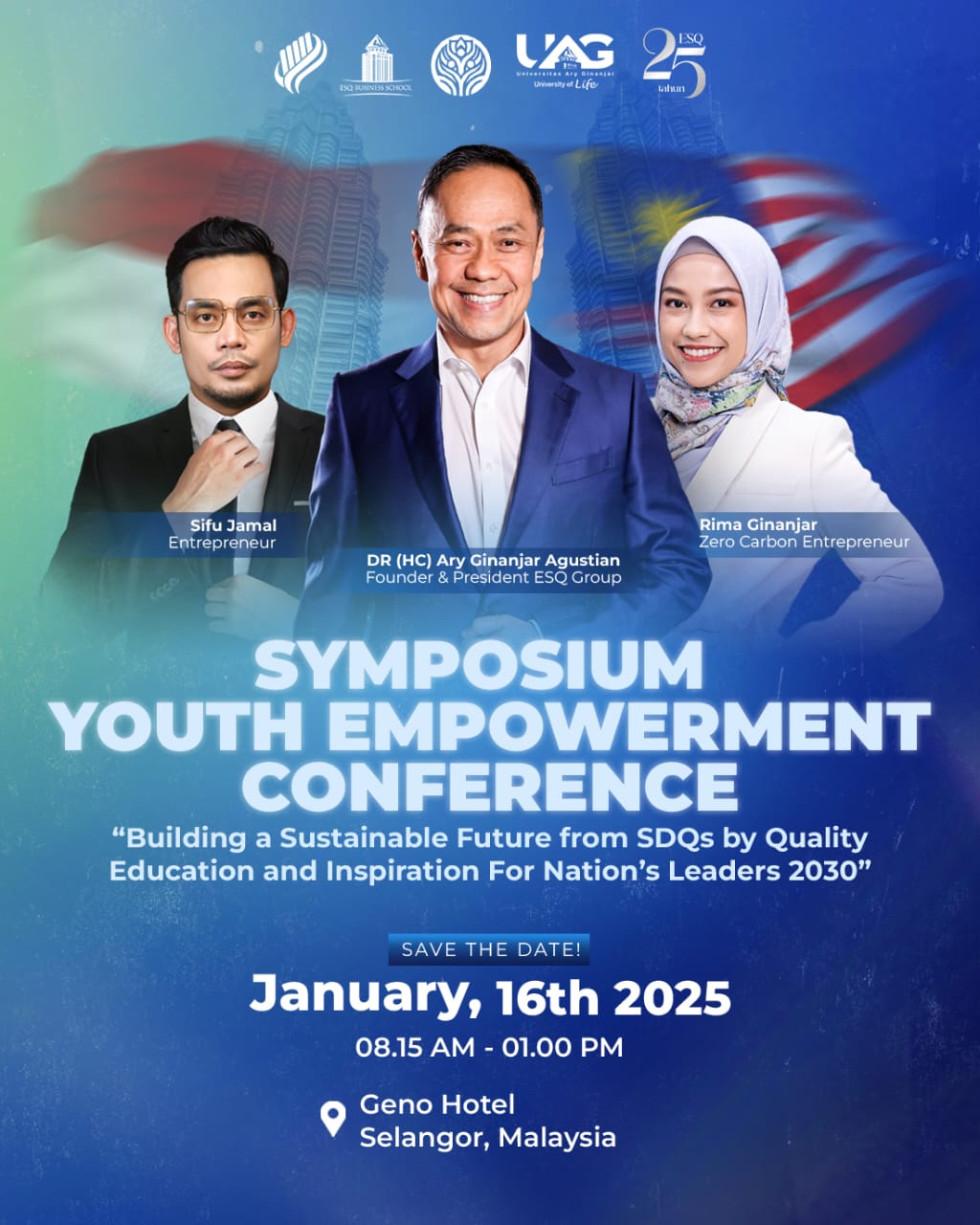 ESQNews.id, MALAYSIA - Segera berlangsung "Symposium Youth Empowerment Conference (YEC)" yang diinisiasi oleh UAG University & ESQ Business School di bawah naungan Dr. (H.C) Ary Ginanjar Agustian pada tanggal 16 Januari 2025 di Geno Hotel, Selangor, Malaysia.