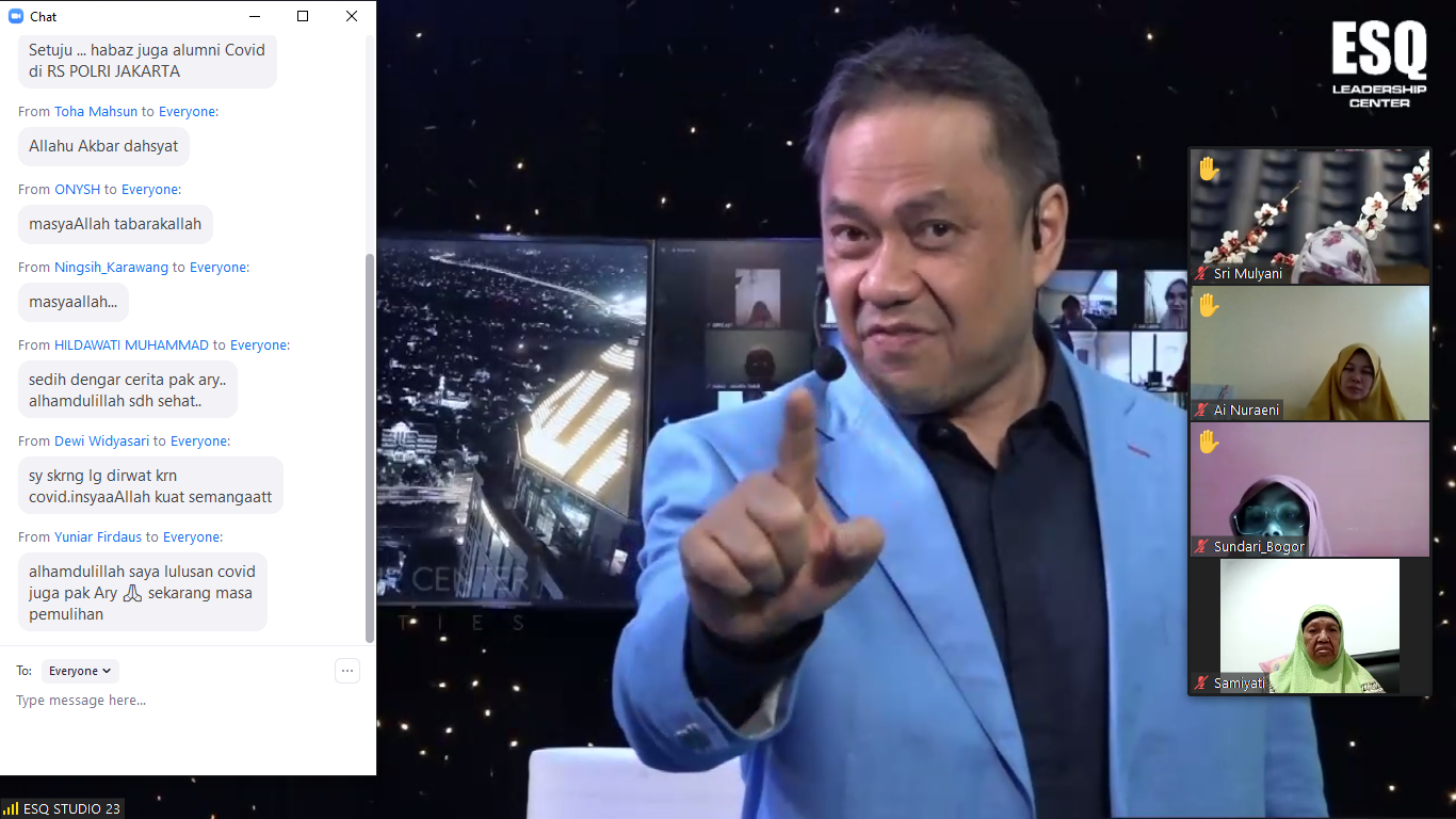 Ary Ginanjar bersama tim ESQ memberikan 2 metode sebagai solusi hadapi pandemi yakni Neuro Linguistik Program, Hypnotheraphy serta kisah-kisah nyata tentang kehidupan kepada mereka. Tak hanya itu, Tokoh Pembangunan Karakter membagikan kisahnya setelah mendapat gelar baru sebagai Penyintas Covid-19.