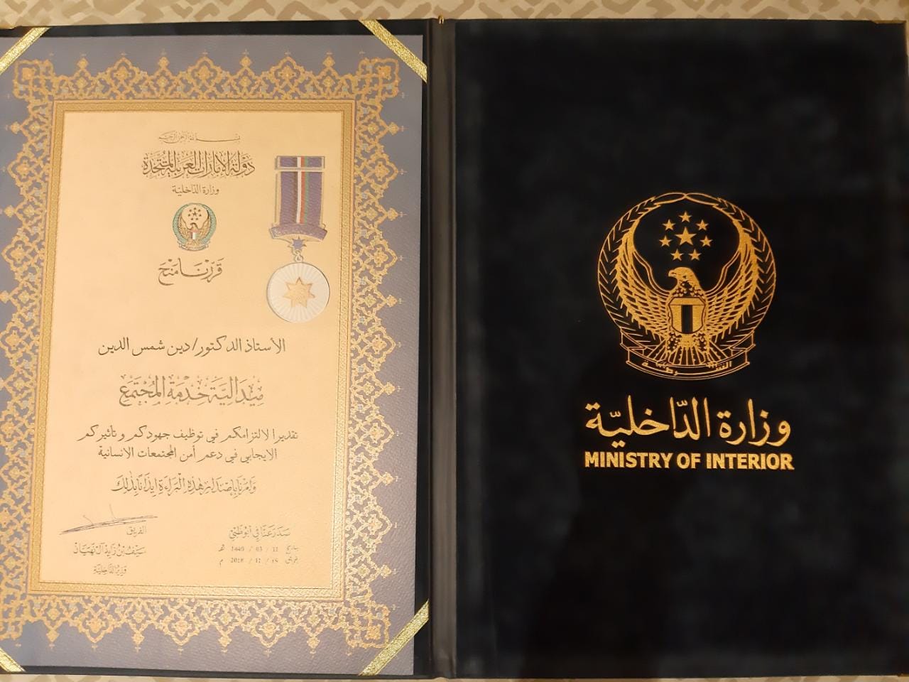 Penghargaan diserahkan oleh YM. Sheikh Mohammed bin Zayed al-Nahyan, Wakil Perdana Menteri & Menteri Dalam Negeri dan Putra Mahkota Abu Dhabi, di Abu Dhabi, 19 Nopember 2018. Din Syamsuddin diundang ke Abu Dhabi utk menghadiri konperensi  Interfaith Alliance for Safer Community.