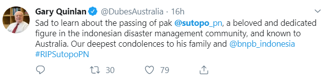 Adapun duka para warganet di akun @Sutopo_PN yang menumpahkan kesedihaannya. Diantaranya dari @DubesAustralia.