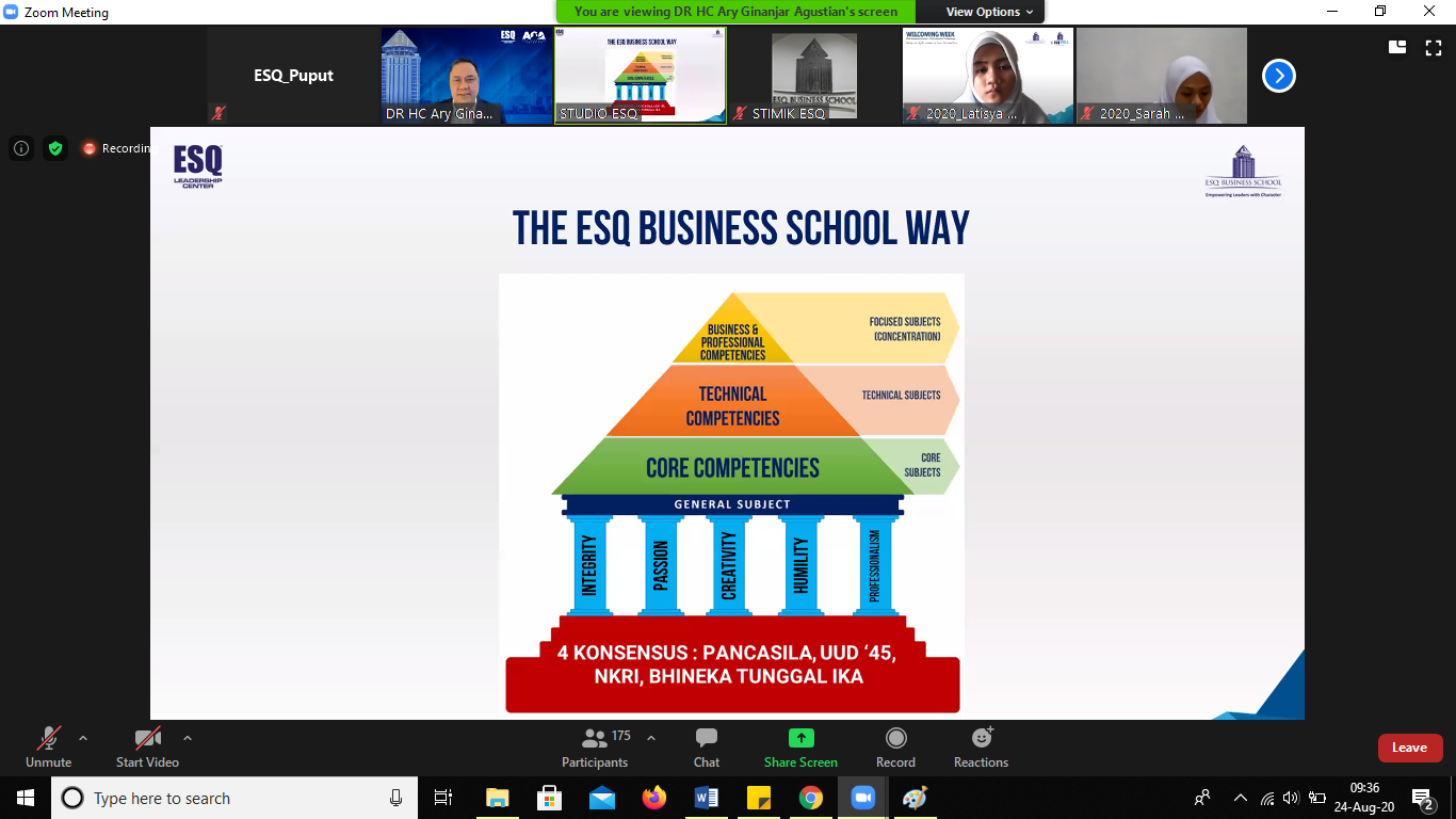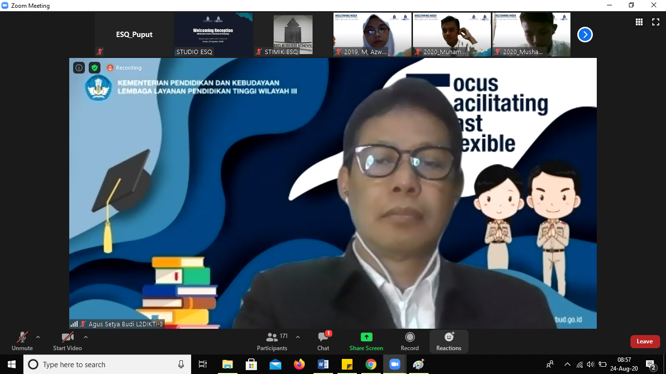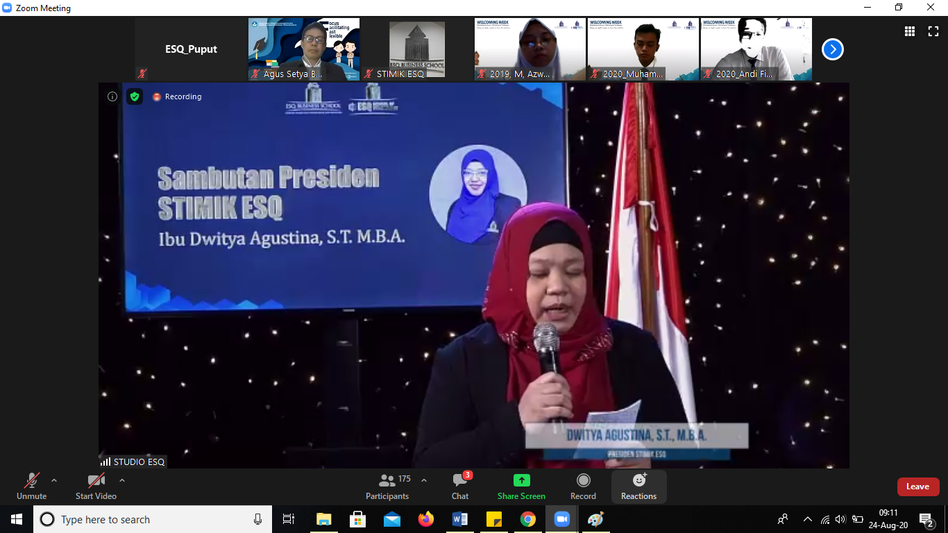 ESQNews.id, JAKARTA - 24 Agustus 2020, diselenggarakannya acara Resepsi Penyambutan Mahasiswa Baru Tahun Akademik 2020/2021 Sekolah Tinggi Ilmu Manajemen dan Ilmu Komputer (STIMIK) ESQ. Mengusung tema Being An Agile Leader in New Normal Era yang dilaksanakan secara online.