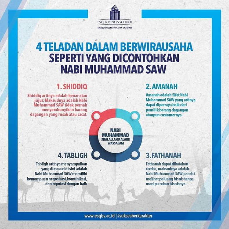 Nah bagi kamu generasi muda yang saat ini sedang merintis bisnis, ESQ Business School (EBS) membagikan 4 teladan dalam berwirausaha seperti yang dicontohkan Nabi Muhammad SAW, yakni sebagai berikut: