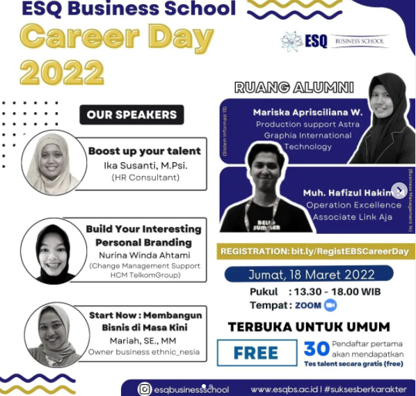 ESQNews.id, JAKARTA – ESQ Business School (EBS) menghadirkan acara yang tentunya akan sangat bermanfaat apalagi untuk kamu yang sedang memilih career ataupun bingung career seperti apa yang akan kamu ambil. Acara tersebut yaitu EBS Career Day 2022, yang akan digelar pada Jumat, 18 Maret 2022 Pukul 13.30-18.00 WIB secara online melalui Zoom Meeting.