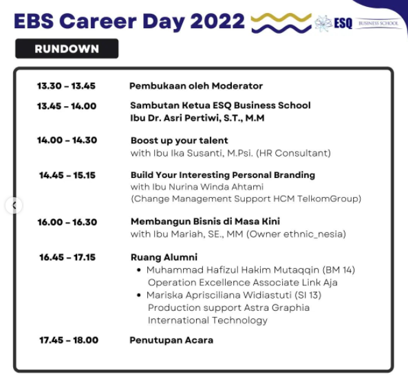Kegiatan EBS Career Day in akan menghadirkan beberapa narasumber yaitu Ika Susanti, M.Spi. (HR Consultant), Nurina Winda Ahtami (Change Managements Support HCM TelkomGroup), dan Mariah, SE.,MM (Owner Business ethnic_nesia).