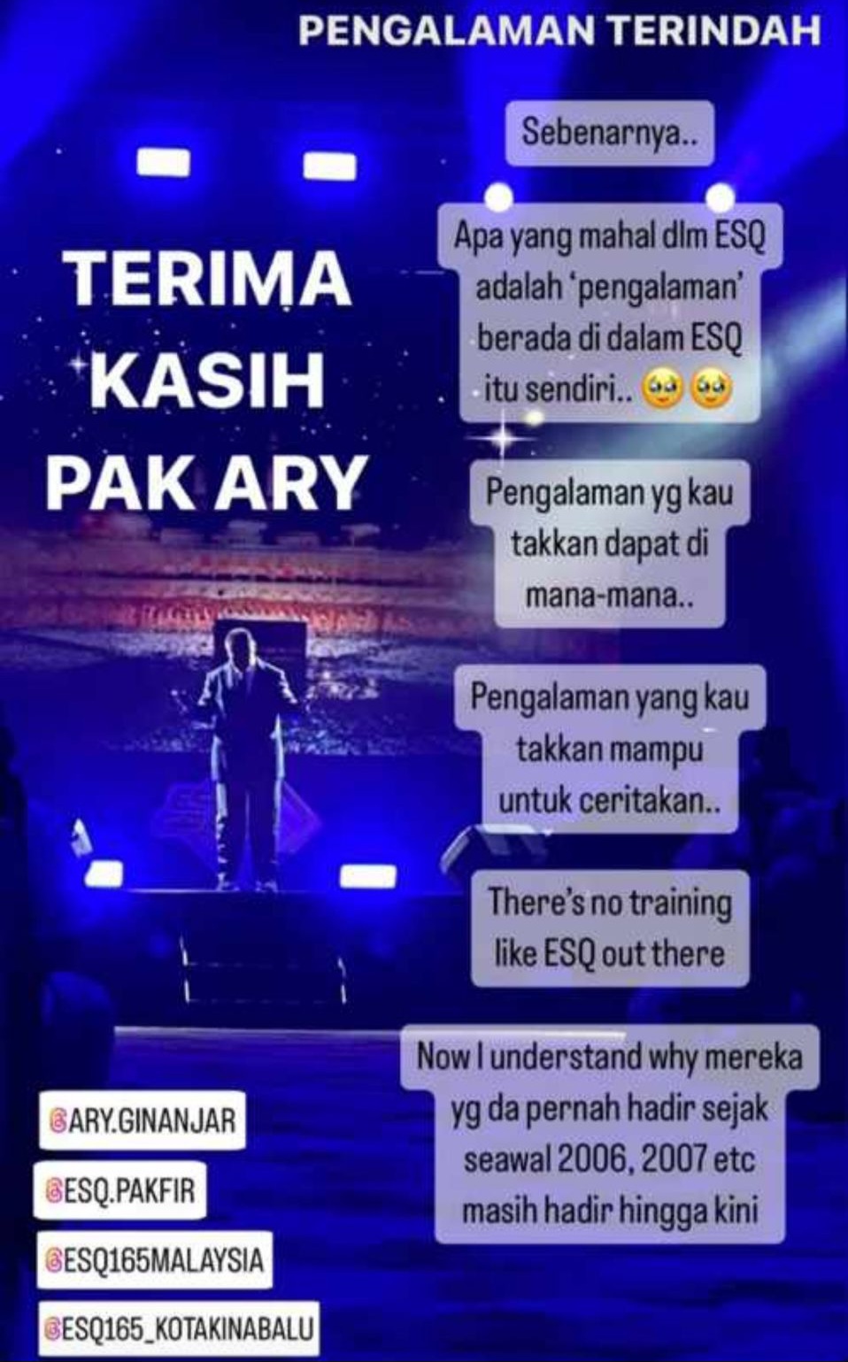 Lebih lanjut, "Bersyukur ESQ bisa menjadi bagian kecil dari transformasi diri alumni ESQ Malaysia. Semoga ilmu dan hidayah yang telah didapat kekal abadi selamanya di dalam hati dan menjadi amal ibadah yang luhur dalam keseharian. Terimakasih Malaysia."