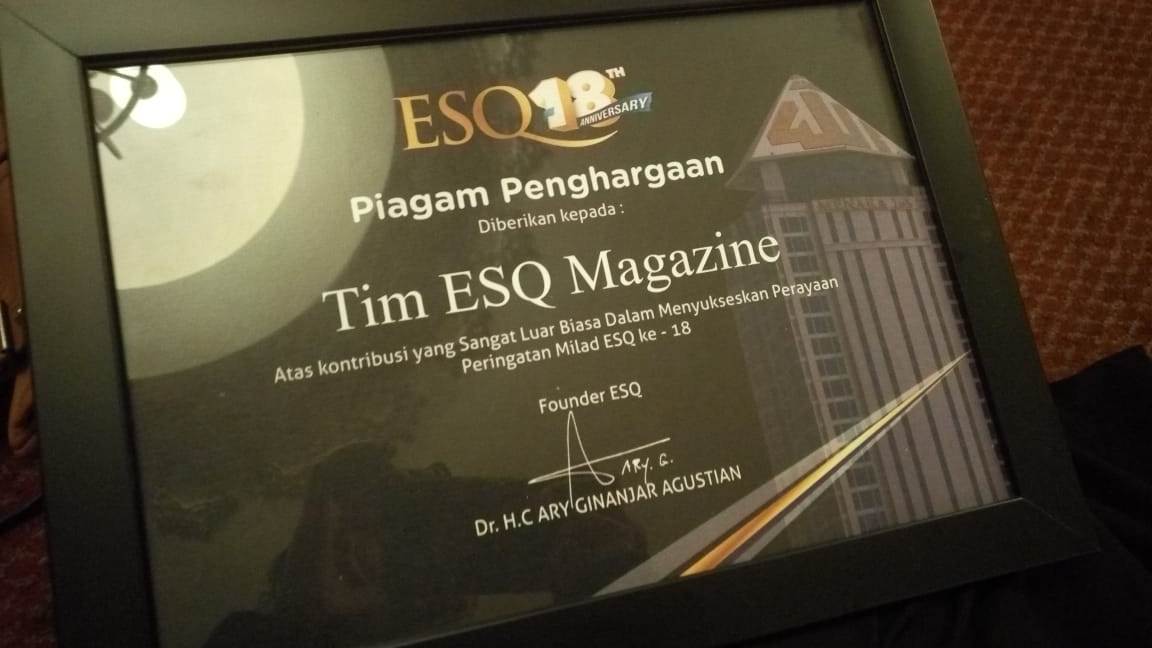 ESQNews.id, JAKARTA - ESQ Magz mendapat penghargaan kontribusi luar biasa dari CEO ESQ Group, Ary Ginanjar Agustian. Bentuk penghargaan tersebut sebagai penghargaan partisipasi tim ESQ Magz dalam pemberitaan Milad ESQ ke-18.