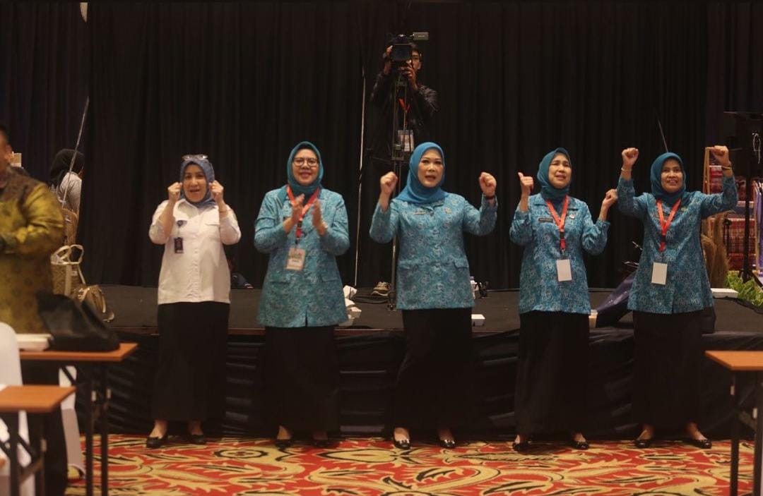 PKK Sumsel Feby Deru pun terlihat antusias dan semangat saat memperagakan