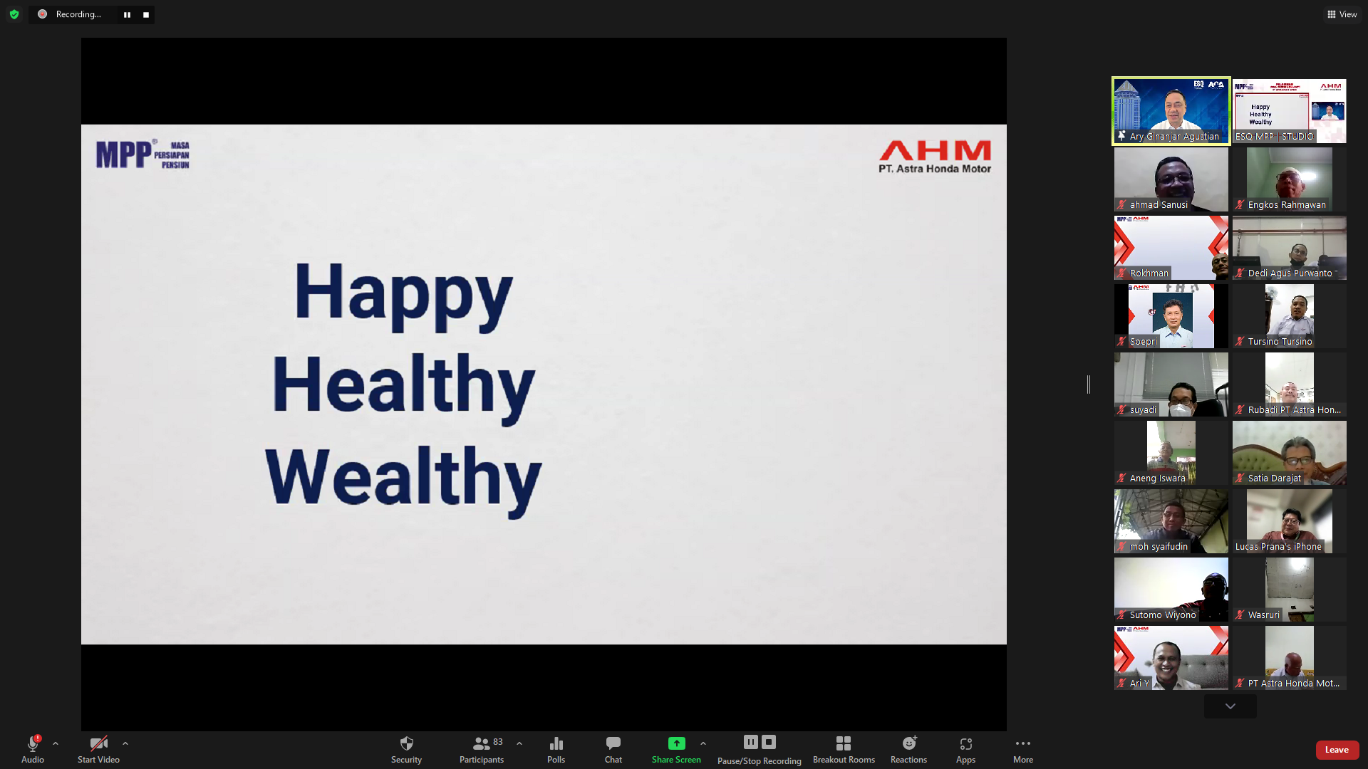 "Sebagai seorang calon pensiunan, yang paling penting adalah kita harus hidup dengan Happy, selanjutnya Healthy, bukan hanya secara fisik, namun juga secara batin. Kalau batin sakit maka badan juga akan sakit. Terakhir adalah Wealthy, yaitu hasil karena kita Happy dan karena kita Healthy,” papar Ary, terlihat senyuman manisnya di layar Zoom.