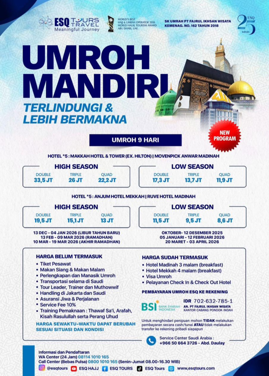 Harga mulai Rp 8,6 juta/orang, dengan pilihan High Season dan Low Season. Semua paket sudah terdaftar resmi di sistem Kementerian Haji dan Umrah, dan didukung call center 24 jam di Saudi maupun Indonesia.