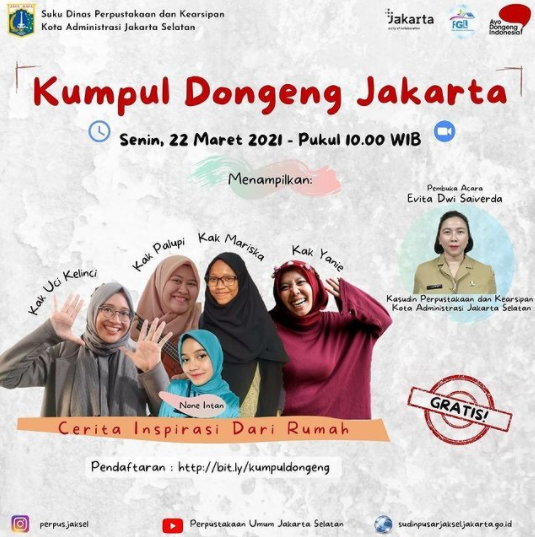 Kali ini dalam rangka memperingati Hari Dongeng Sedunia, Sudin Pusip Jaksel bersama komunitas literasi akan menyelenggarakan “Kumpul Dongeng Jakarta” yang kedua kalinya dengan tema "Cerita Inspirasi dari Rumah".