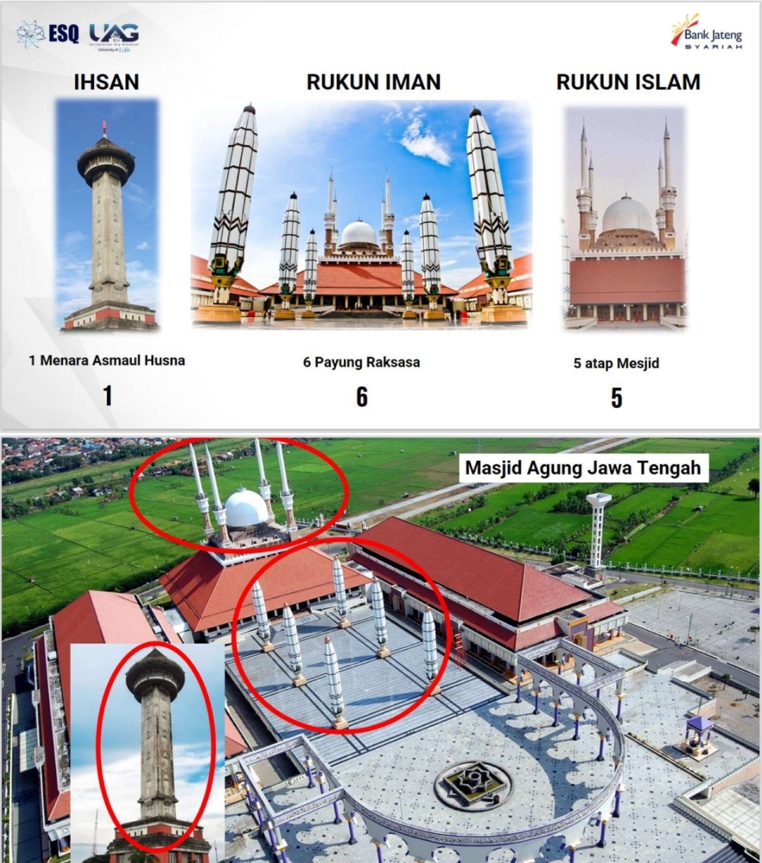 Itu lah 165 di Masjid Agung Jawa Tengah. 1 itu Ihsan, engkau berbuat baik seakan-akan melihat dan dilihat oleh Allah. 6 itu adalah Rukun Iman yang membentuk mental yang kuat serta 5 Rukun Islam."