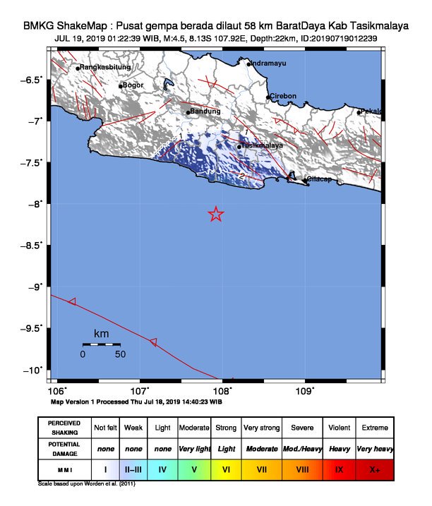 Gempa yang terjadi berkekuatan: Magnitudo 4.5. Lok: 8.13 LS, 107.92 BT (Pusat gempa berada dilaut 58 Km Barat Daya Kab Tasikmalaya). Dengan kedalaman 22 Km.