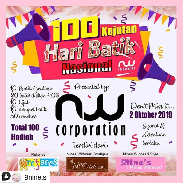 Ada 100 Kejutan dari NW Corp nih! Hadiah 3 Gamis Batik buat ukhty yang paling banyak Repost postingan ini. GIVE AWAY dimulai sekarang ya tepatnya tanggal 2 Oktober 2019, dan akan berakhir besok pukul 09.00 WIB.