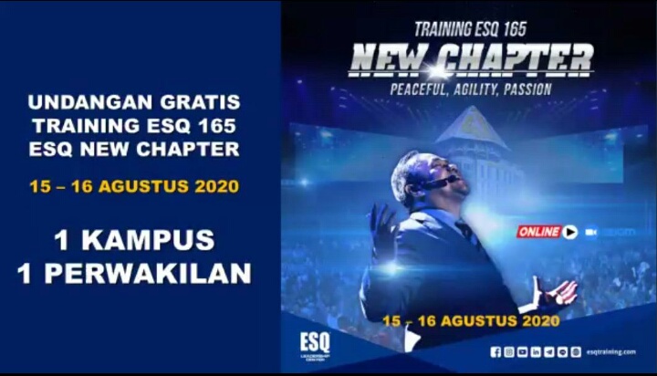 Selain undangan gratis Amazing You 2020. Adapula undangan gratis di Training ESQ New Chapter. Berlaku 1 kampus 1 perwakilan. Diselenggarakan tanggal 15-16 Agustus 2020.