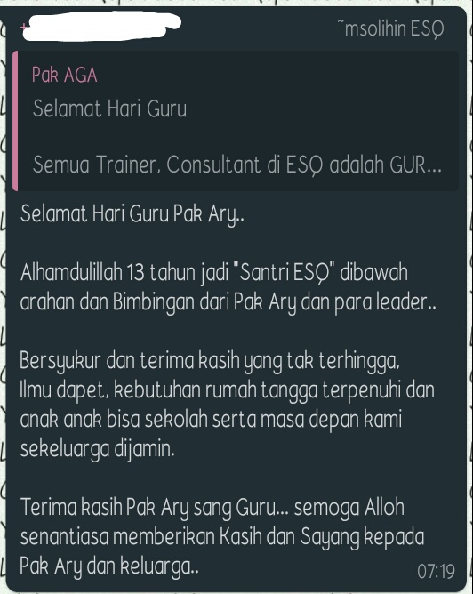 "Semua trainer, consultant, dosen di ESQ adalah GURU. Semoga Allah merahmatimu aamiin."