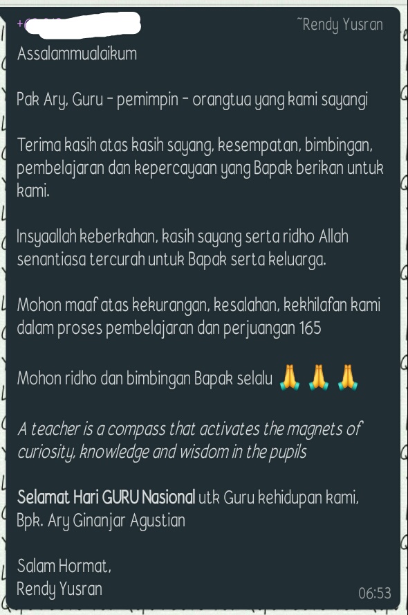 "Selamat Hari Guru. Terimakasih Guru dimanapun dirimu berada. Doa kami untukmu," ucap Dr. (H.C) Ary Ginanjar Agustian (CEO ESQ Group) kepada seluruh guru di penjuru Nusantara.