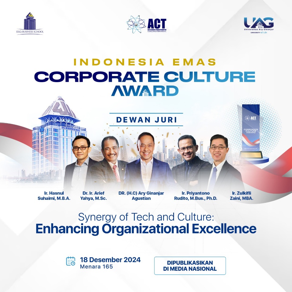Indonesia Emas Corporate Culture Award yang diinisiasi oleh ACT Consulting International (ESQ Corp) bersama dengan ESQ Business School dan UAG University tersebut akan digelar pada tanggal 18 Desember 2024 di Menara 165, Jakarta Selatan.