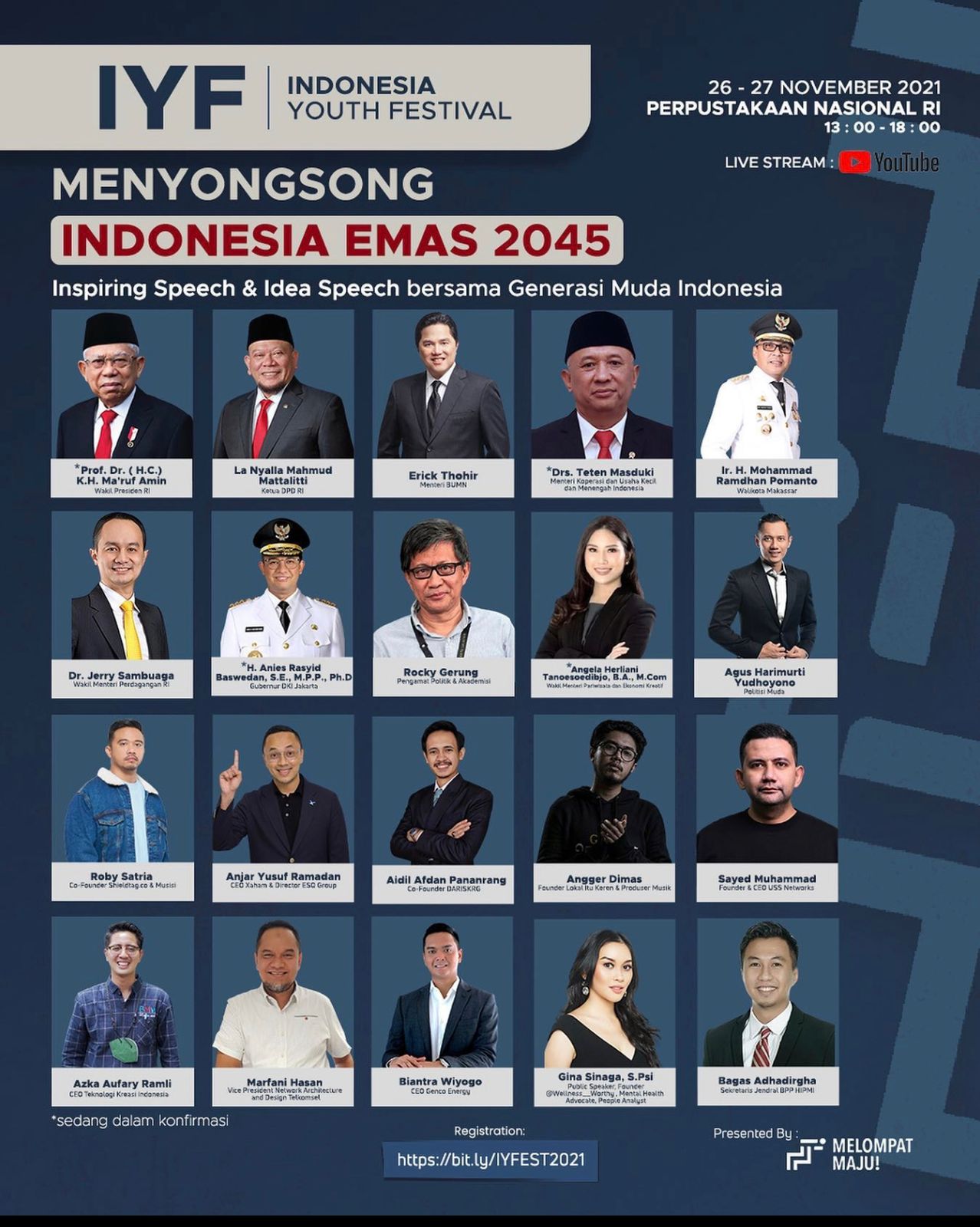 Acara tersebut menghadirkan banyak speakers untuk membagikan ide dan sudut pandangnya bagi generasi muda Indonesia, mulai dari Menteri, Wakil Menteri, Gubernur atau Walikota, Politisi, dan Para CEO Muda.
