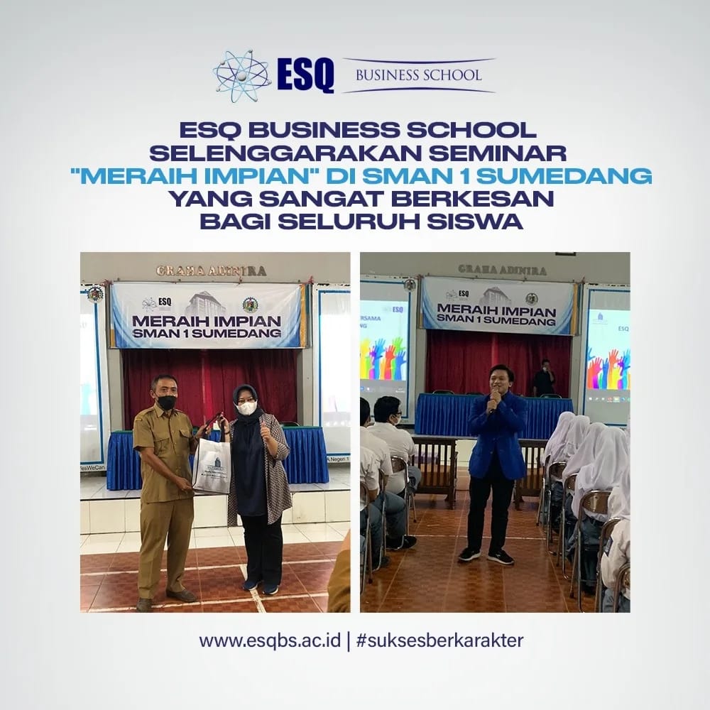 ESQNews.id, JAKARTA - Pada Hari Senin (07/02) serta hari Selasa (08/02) ESQ Business School menyelenggarakan seminar secara Offline (Luring) di SMA Negeri 1 Sumedang dengan tajuk “Meraih Impian.” Acara ini diikuti lebih dari 100 siswa/siswi SMA Negeri 1 Sumedang.