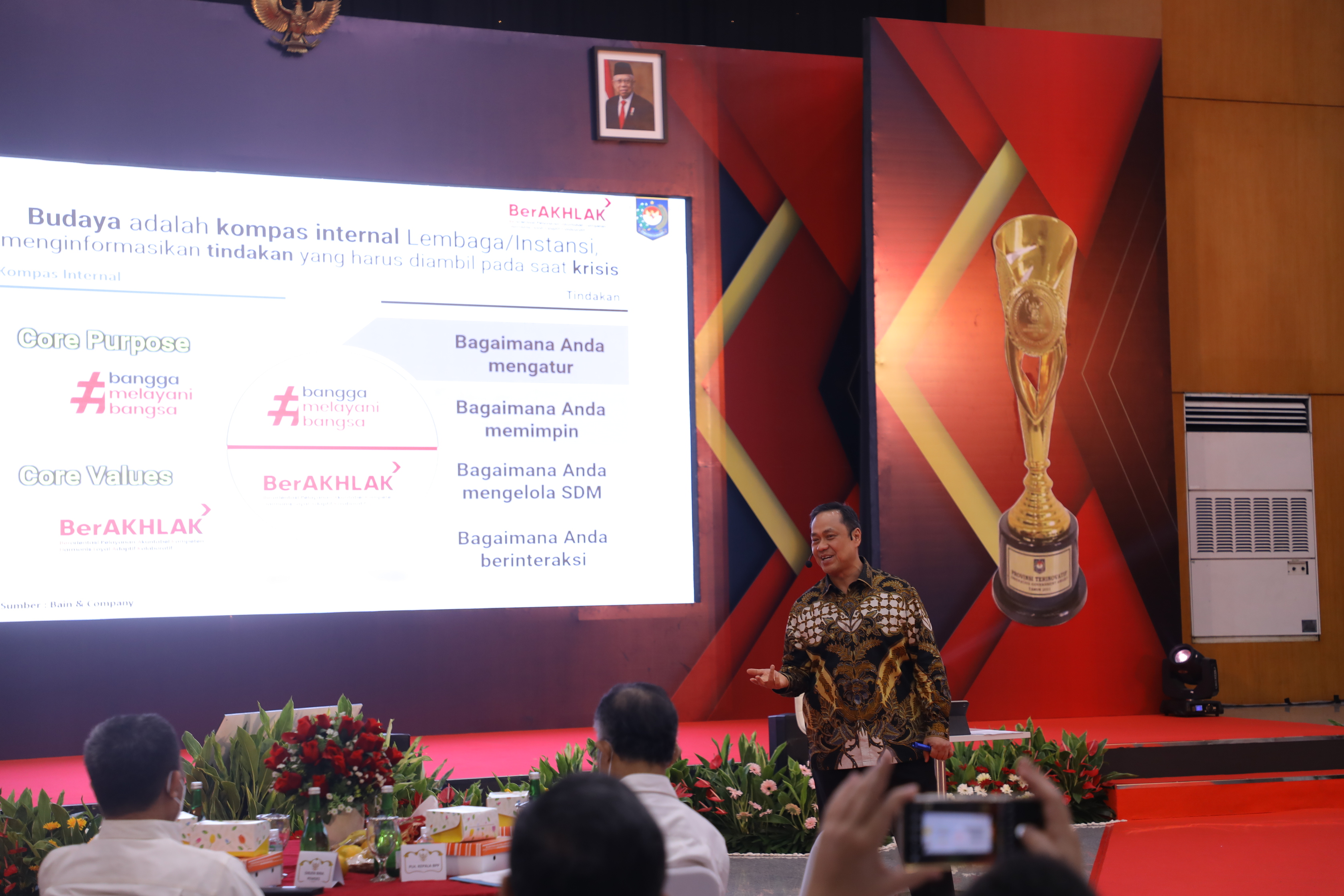 Ary menjelaskan lebih lanjut, "Kompas di Kemendagri yaitu memegang teguh core purpose atau bangga melayani bangsa. Jangkarnya adalah core values Ber-AKHLAK. Sedangkan kipas artinya move on dari segala keadaan. Itulah alasan Jepang bisa bertahan 1000 tahun, karena mempunyai pondasi yang kuat."