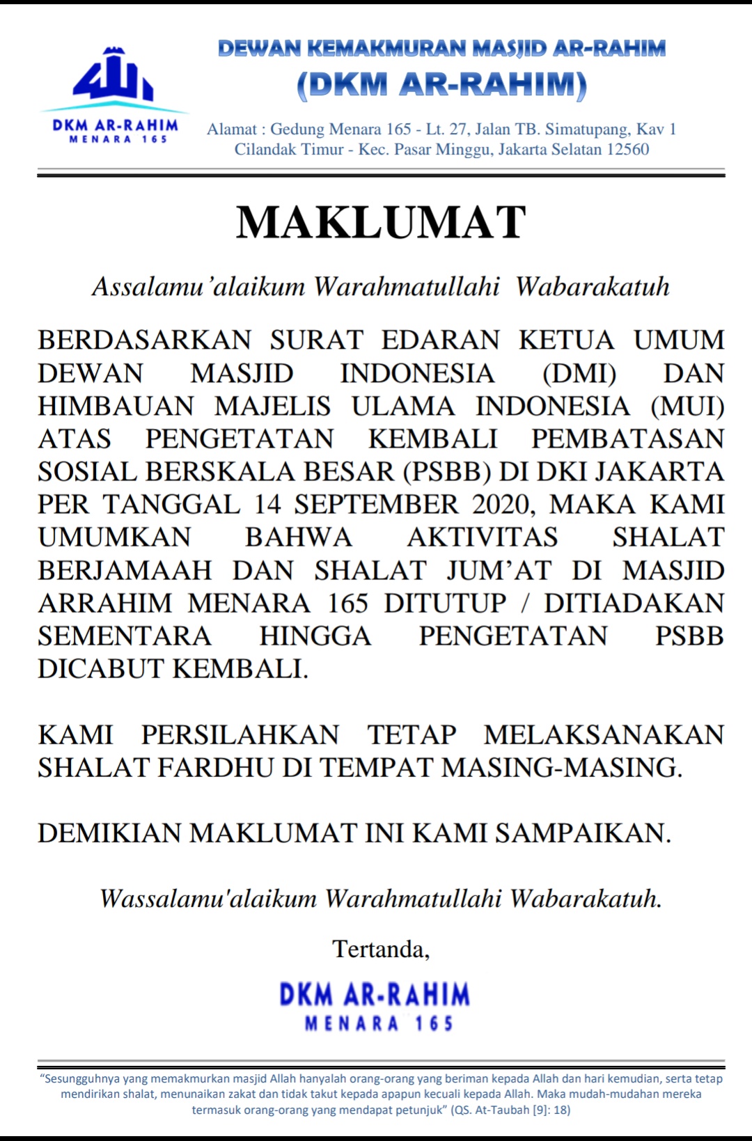 Maka dari itu, aktivitas di Kota Metropolitan sangat dibatasi dan diperketat anjuran untuk mentaati protokol kesehatan. Termasuk aktivitas shalat berjamaah dan shalat Jumat di Masjid Ar-Rahim lantai 27 Menara 165 ditutup sementara.