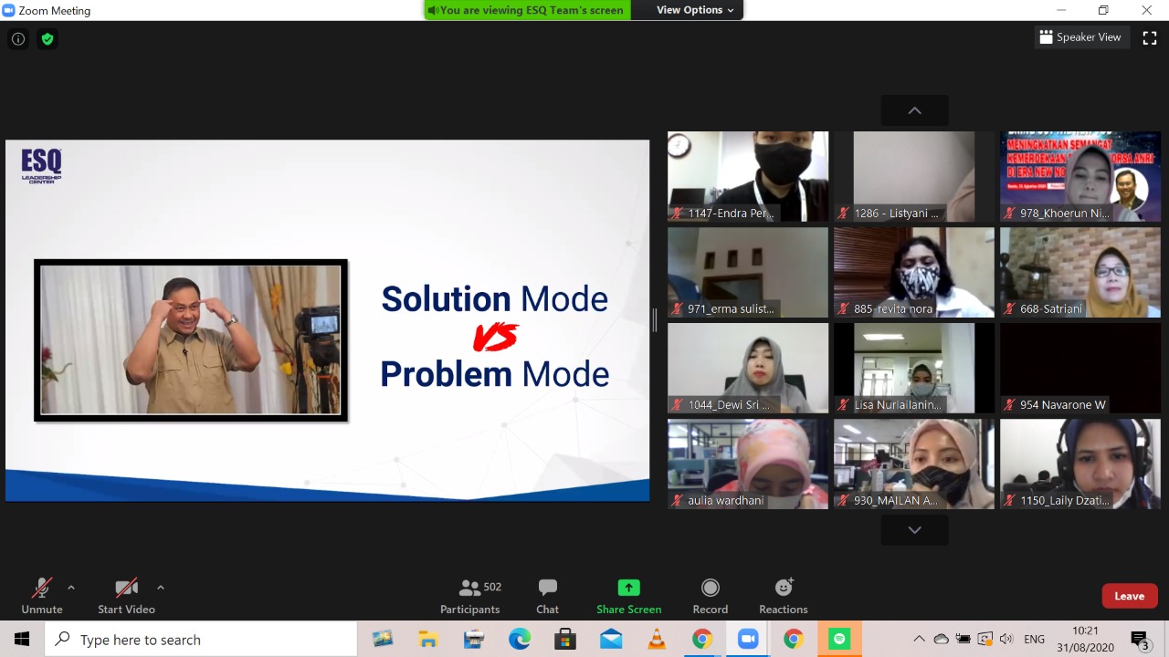 Training secara daring itu mengusung tema ‘Bring Out To The New You’. Dipandu langsung oleh trainer ESQ Licensed Dr. HC. Ary Ginanjar Agustian yaitu Coach Dudi dan Coach Tiko.